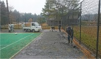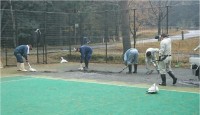 活動内容は、新燃岳の噴火の影響による、テニスコートに積もった火山灰の撤去作業です。